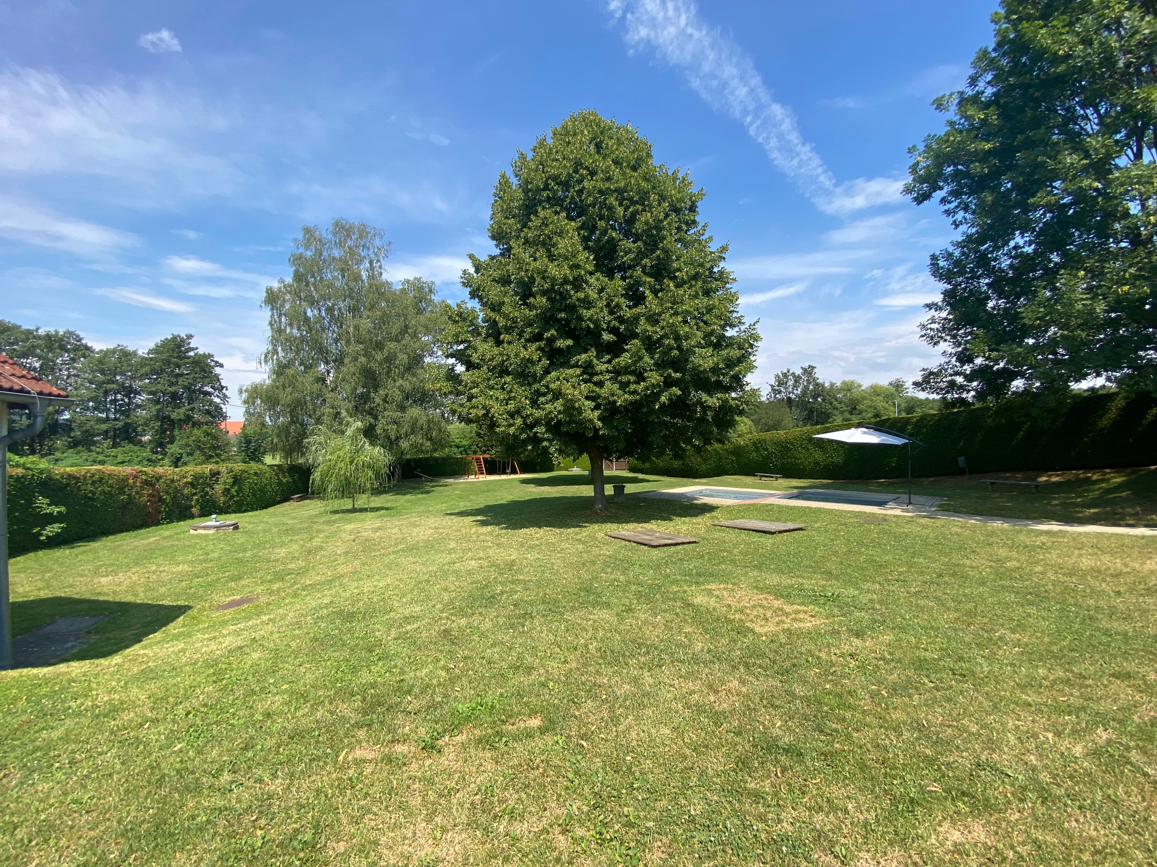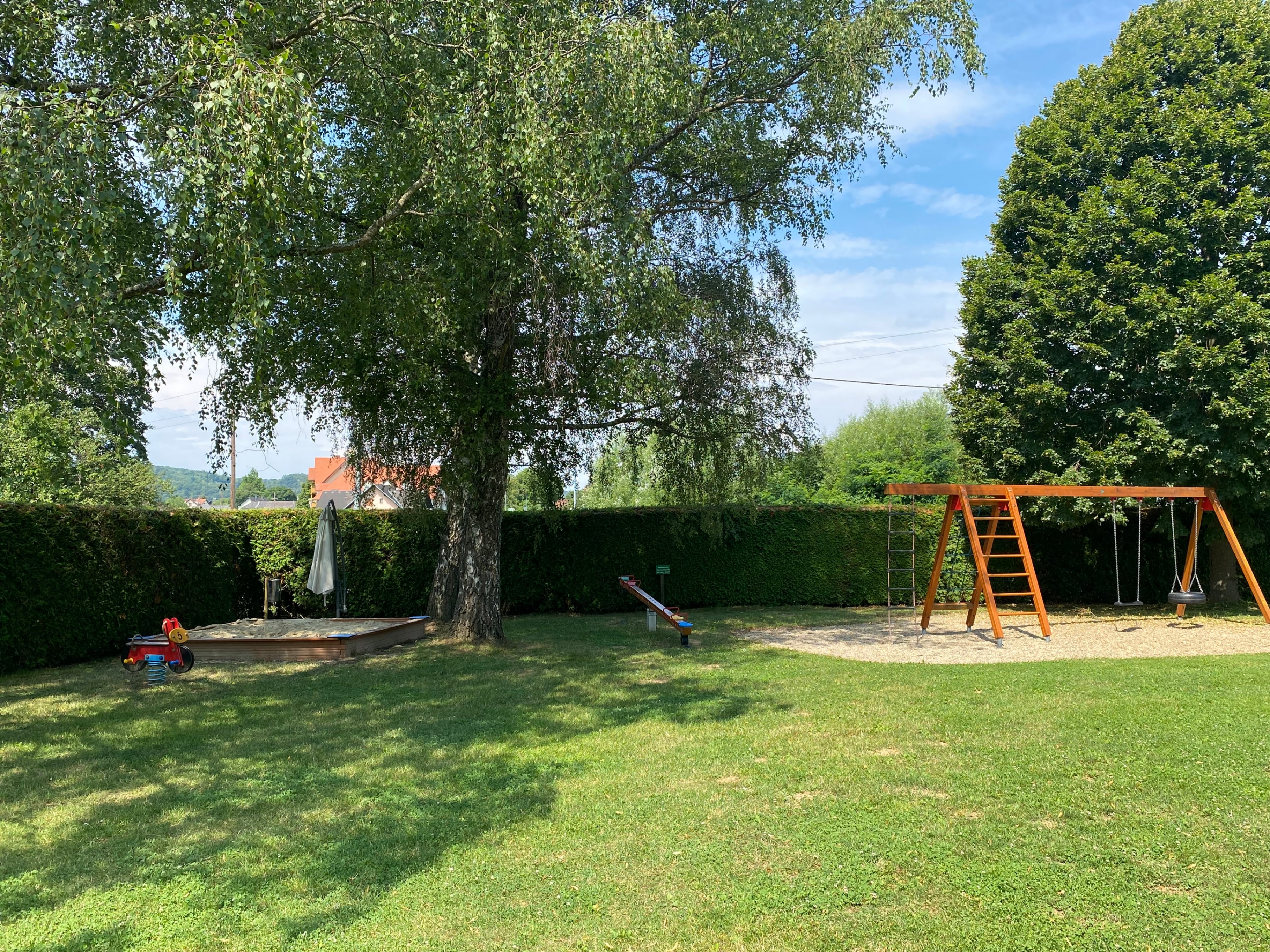 Für die Kinder gibt es auch einen modernen Spielplatz, der direkt neben dem Freibad liegt. Hier können die Kleinen nach Herzenslust klettern, schaukeln und toben. Der Spielplatz ist mit sicheren und altersgerechten Geräten ausgestattet, die zu fantasievollem Spiel und Bewegung anregen. Während die Kinder sich austoben, können sich die Eltern auf den großzügigen Liegewiesen entspannen und die Natur genießen. Die Liegewiesen bieten ausreichend Platz für Picknicks, zum Sonnenbaden oder einfach zum Entspannen. Der Blick auf das Freibad und die umliegende Landschaft sorgt für eine ruhige, angenehme Atmosphäre.