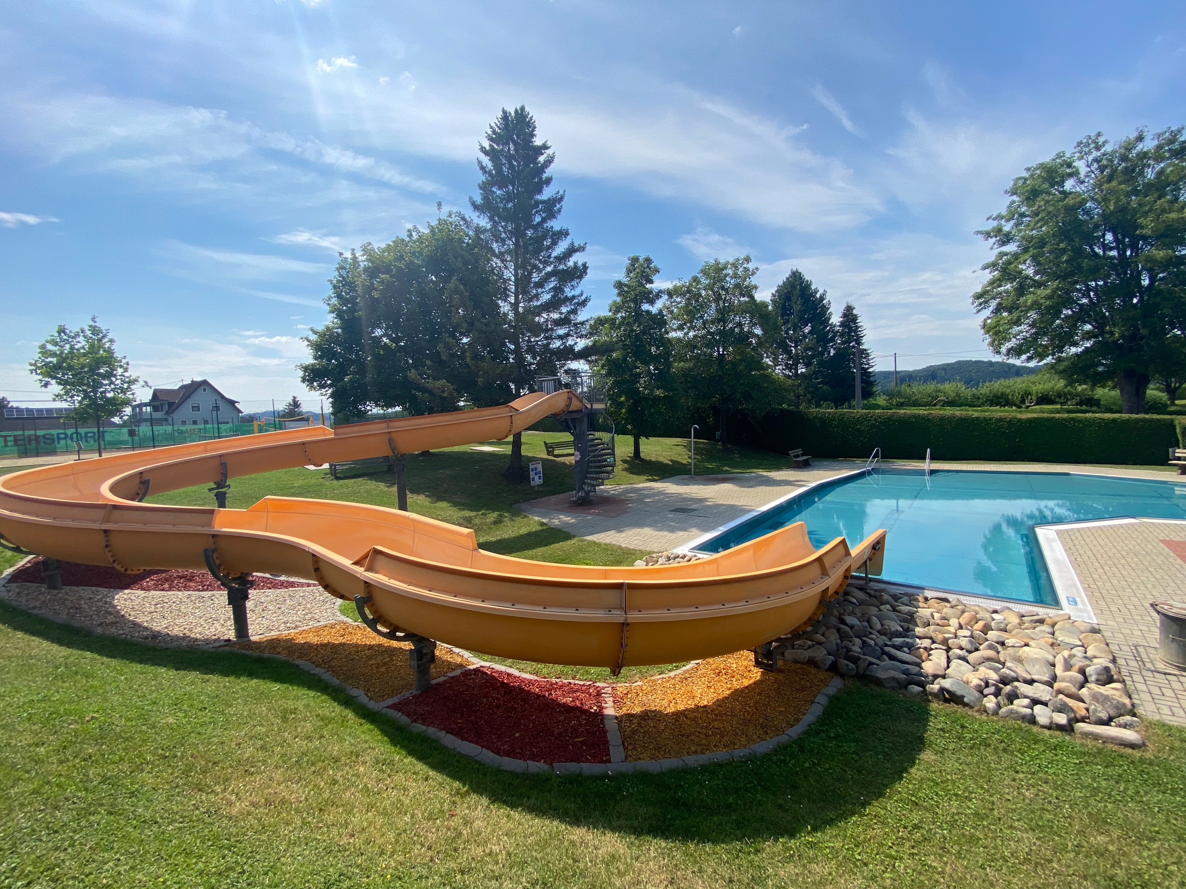 Ein weiteres Highlight ist die 35 Meter lange Rutsche. Sie sorgt für Nervenkitzel und Spaß für Kinder und Erwachsene gleichermaßen. Die Rutsche ist sicher und sorgt für jede Menge Abwechslung, sodass es immer wieder ein Vergnügen ist, sich hinabgleiten zu lassen. Sie ist perfekt für alle, die gerne etwas mehr Action wollen, ohne das entspannte Flair des Freibades zu verlieren.