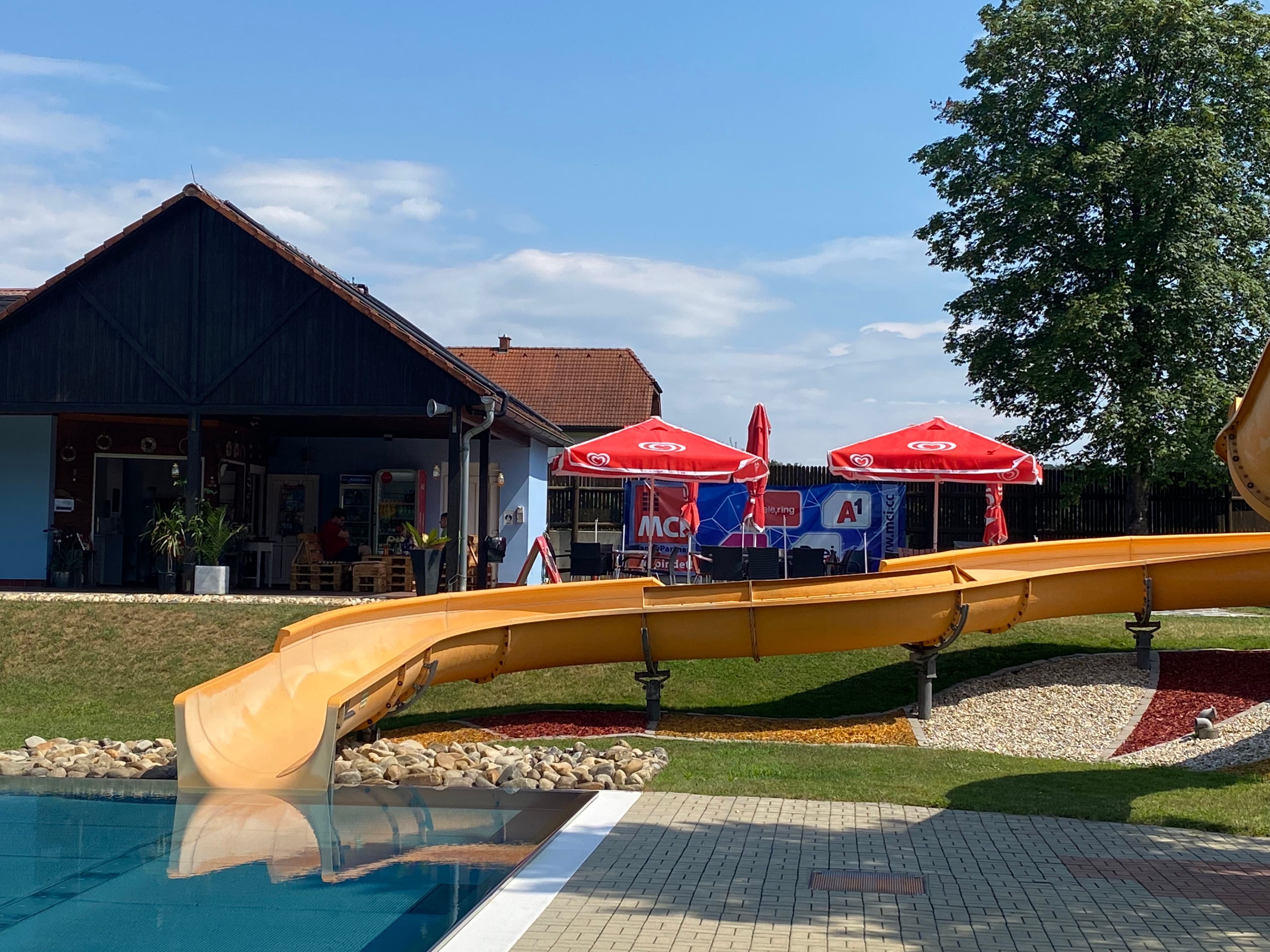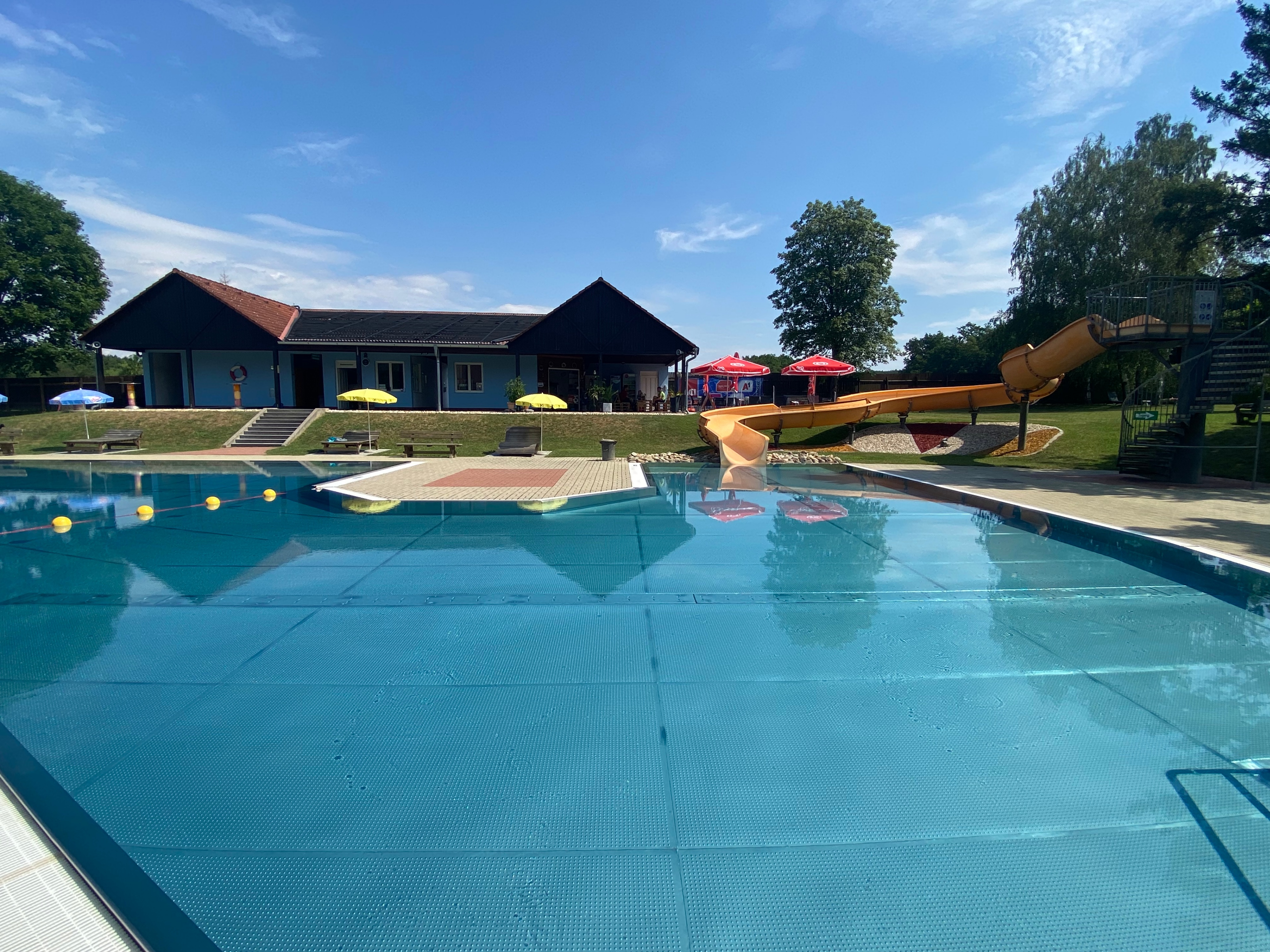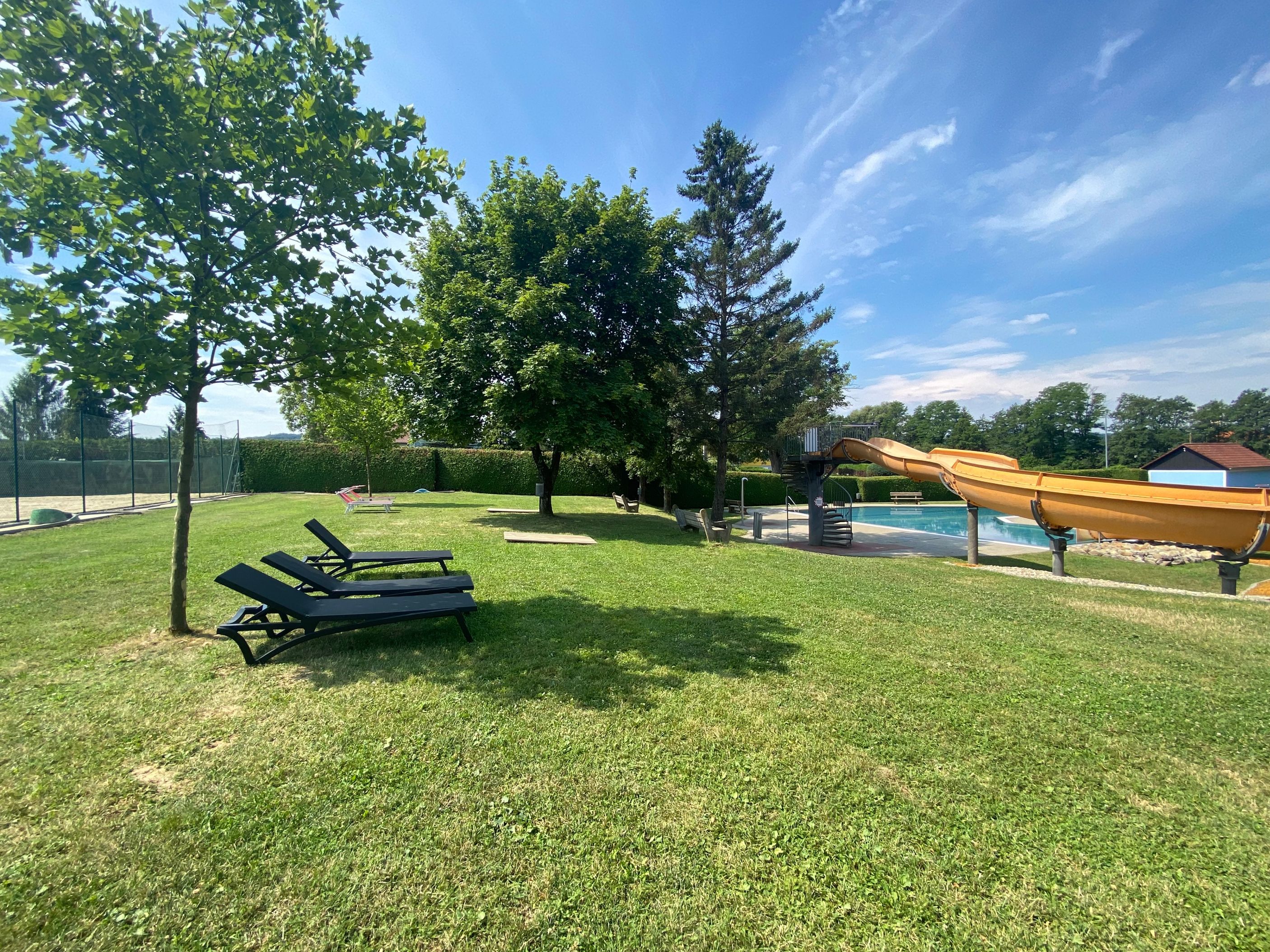 Ein weiteres Highlight ist die 35 Meter lange Rutsche. Sie sorgt für Nervenkitzel und Spaß für Kinder und Erwachsene gleichermaßen. Die Rutsche ist sicher und sorgt für jede Menge Abwechslung, sodass es immer wieder ein Vergnügen ist, sich hinabgleiten zu lassen. Sie ist perfekt für alle, die gerne etwas mehr Action wollen, ohne das entspannte Flair des Freibades zu verlieren.